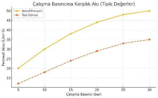 Aşağıdaki grafikte, NF’nin ters ozmoza göre aynı basınçta daha yüksek permeat akısı sunduğu görülmektedir (tipik değerler, 25 bar’da ≈ 48 L m⁻² h⁻¹). Bu, enerji tasarrufunun ana nedenidir.